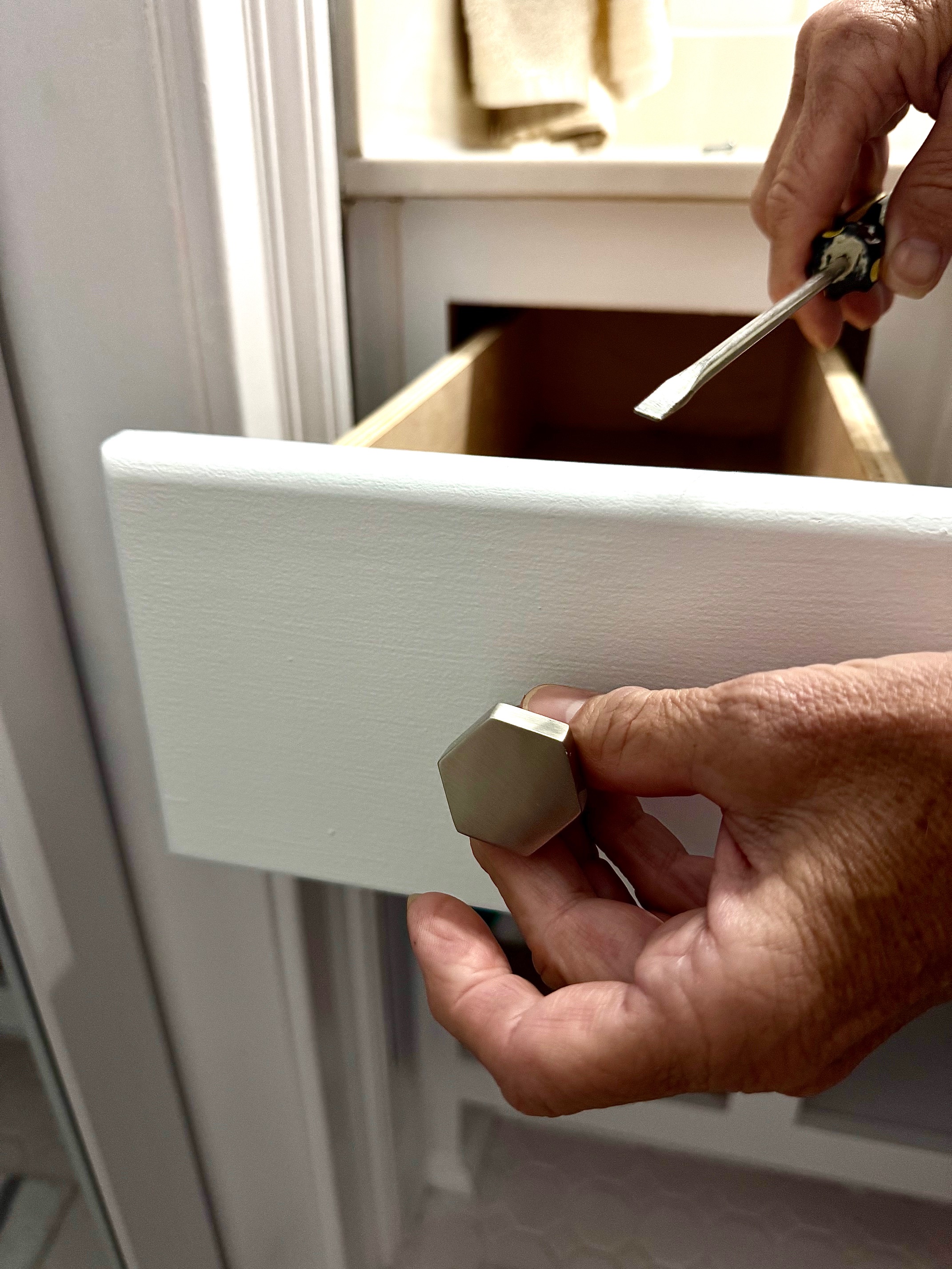Outdated or original builder grade cabinet hardware can date a kitchen or bathroom more then you realize. I recently changed the cabinet hardware on the kitchen island and in the boys bathroom. Small price, big impact.