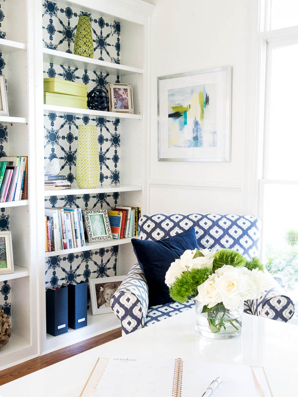 My home office makeover has been a long time coming. Over the years, my home office has worn many different looks—green, beige, gray, and most recently navy. While I loved the depth and richness of navy on the walls (Compass Blue- Behr), it started to feel too closed in. I knew it was time for a change.